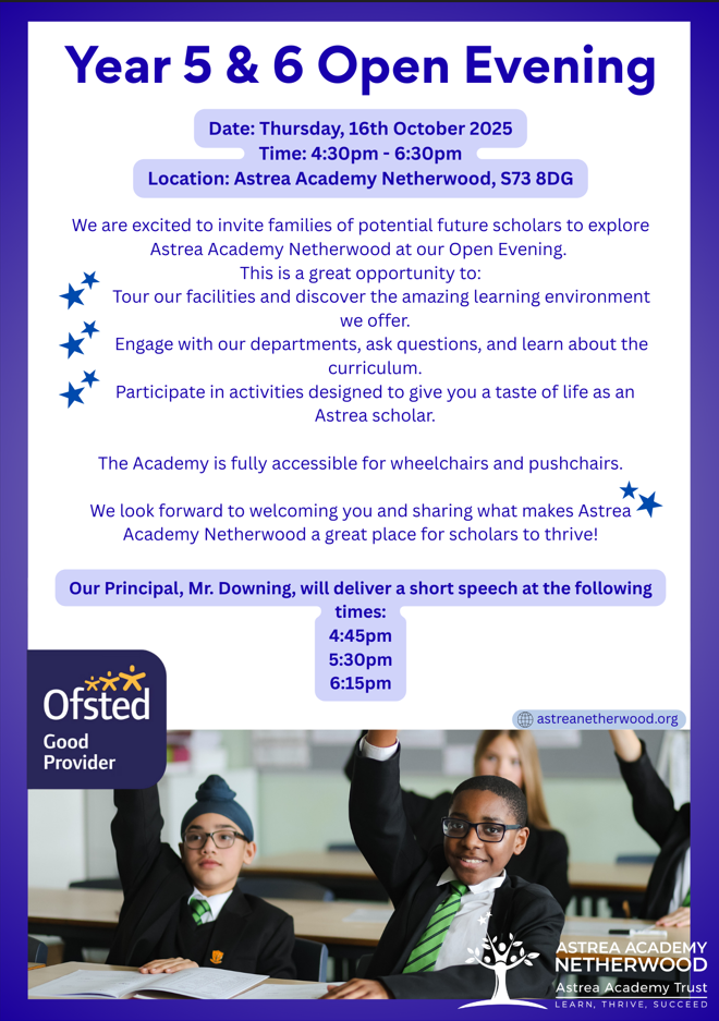Our next Open Evening for Year 5 and 6 will take place on 16th October 4:30 – 6:30pm.
