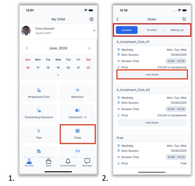 The Clubs and Trips modules can be found on the Dashboard individually, click on the module that you would like to enrol on. There is when you will then be presented with 3 different sections, the first tab will show a list of ‘Available‘ enrollment options, and another section called ‘Enrolled’ and thirdly, if the trip/club is full, there is a ‘Waiting List’ section. When you find the Club/Trip that you would like to enrol and pay for, click on the ‘View Details’, which will provide further information on the club or trip including when it is, how frequent the club runs, the run time and how much it costs.