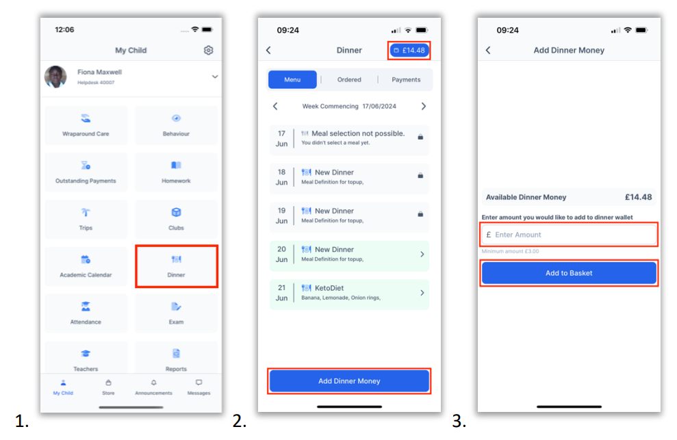 Via the Student Dashboard, navigate to the ‘Dinner‘ module. When you have selected the Dinner module, in the right top corner you will see a blue shape with a picture of a wallet with an amount next to it, this is how much is available for the student to purchase food and drink. To add funds to the account, click on the ‘Add Dinner Money’ button, this will then open another session which you will be able to add the amount that you would like to the account (there is no minimum limit). Once you have typed the amount that you would like to add to the account, click the ‘Add to Basket’ button